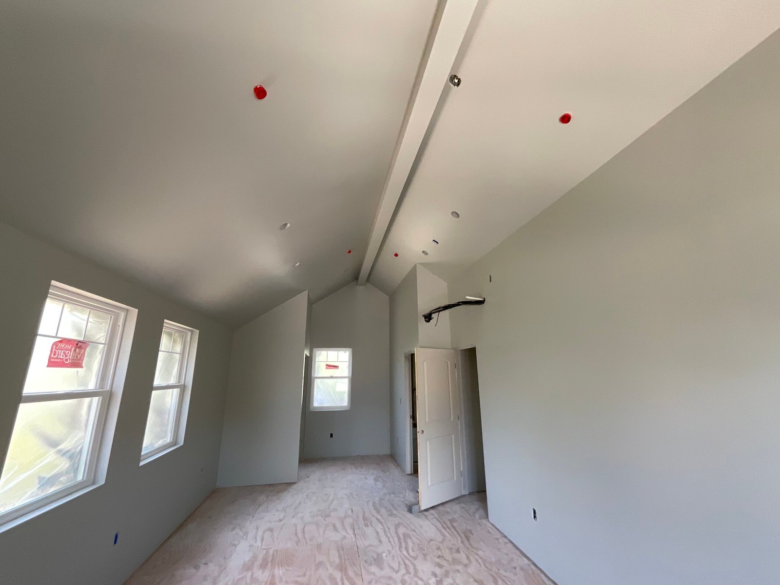 We apply a full skim coat to achieve a uniform Level 5 surface for critical-light areas and premium interiors, per GA-214.